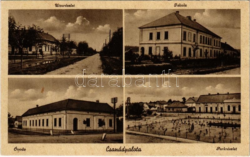 Csanádpalota, utca részlet, iskola, óvoda, park