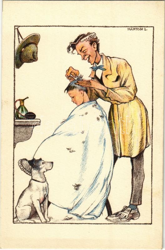 Cserkész a fodrásznál. Kiadja a Magyar Cserkészszövetség Nagytábortanácsa 1926 / Hungarian boy scout art postcard s: Márton L.