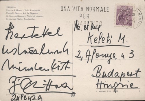 Cziffra György (1921-1994) világhírű zongoraművész autográf képes levelezőlapja Keleti Márton filmrendezőhöz.