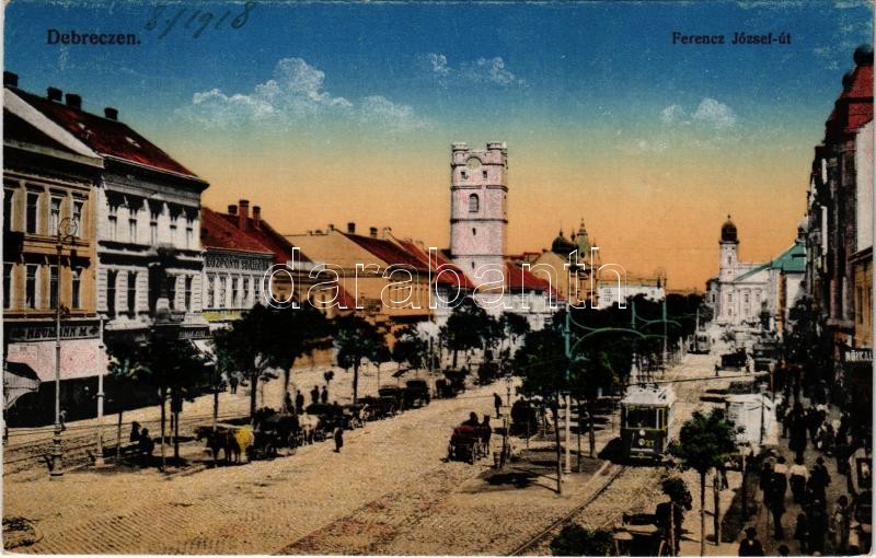 Debrecen, Ferenc József út, villamos, piac, Központi szálloda, Neumann M. üzlete<a href="https://www.darabanth.com/hu/gyorsarveres/414/kategoriak~Kepeslapok/Magyarorszag~1500003/Debrecen-Ferenc-Jozsef-ut-villamos-piac-Kozponti-szalloda-Neumann-M-uzl