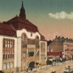 Debrecen, Megyeháza, Schweitzer Testvérek üzlete, Apolló mozgó (mozi), villamos (EK)
