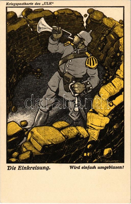 Die Einkreisung. Wird einfach umgeblasen! Kriegspostkarte des ‘ULK’ (Berliner Tageblatt) Nr. 25/105. / WWI German military art postcard, humour s: Kuntze