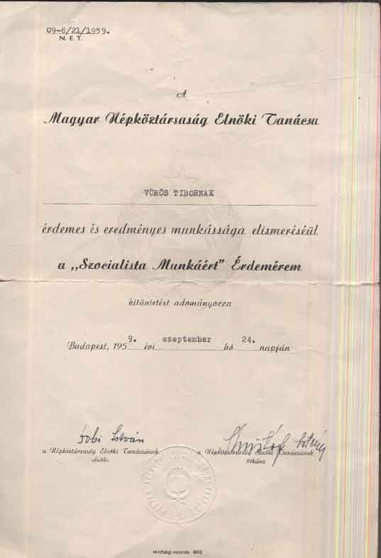 Dobi István (1898-1968) a Magyar Népköztársaág Elnöki Tanácsa elnöke által aláírt kitüntetési oklevél 1959-ből.