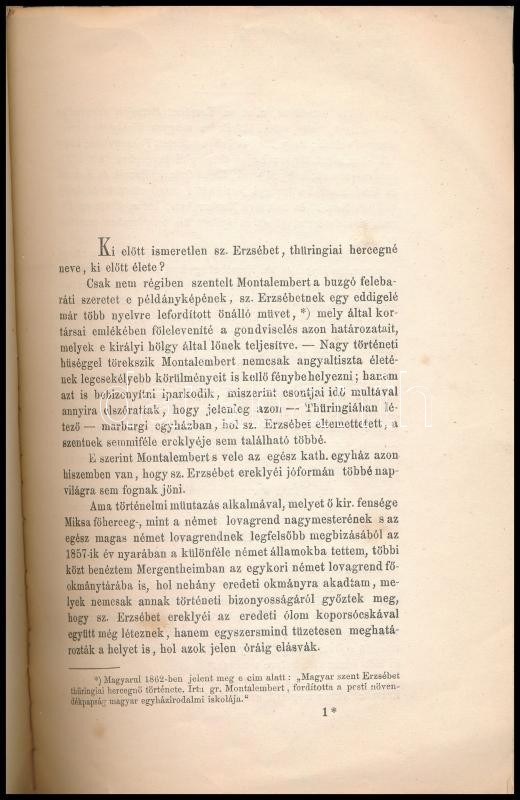 Dr. Dudik B[éla]: Szent Erzsébet ereklyéinek föltalálása. (Függelékül ‘Magyar sz. Erzsébet thüringiai hercegné történetéhez.’) Pest, 1864, Emich Gusztáv, 15 p. Kissé sérült kiadói papírkötésben, a gerincen ragasztással,