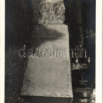Érsekújvár, Nové Zámky; A ledöntött Kossuth-szobor, majd Országzászló talapzata a Szent József temetőben. A rajta lévő megcsonkított 4 fej jellegzetes újvári arcokat ábrázolt, ezek tartották a zászlórudat / toppled and mutilated monument and Hungarian fla