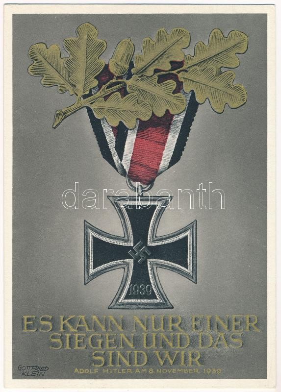 ‘Es kann nur einer siegen und das sind wir’ Adolf Hitler am 8. November 1939 / WWII NSDAP German Nazi Party propaganda postcard, Iron Cross, swastika. 6+19 Ga. s: Gottfried Klein + ‘Großdeutscher Reichstag Berlin 19. 7. 1940.’ So. Stpl.