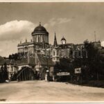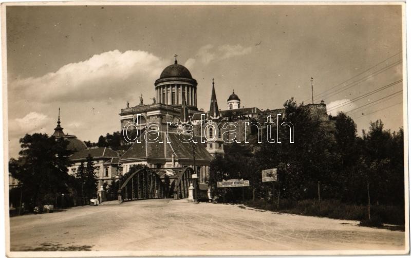 Esztergom, utca, Bazilika, híd, templom, Árpád Kert vendéglő és strandfürdő táblák, utcai árusok. photo<a href="https://www.darabanth.com/hu/gyorsarveres/417/kategoriak~Kepeslapok/Magyarorszag~1500004/Esztergom-utca-Bazilika-hid-templom-Arpad-Kert-v