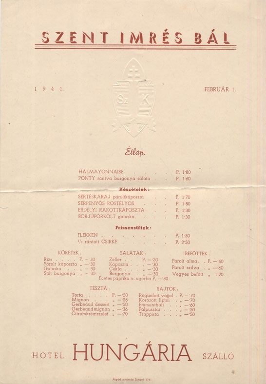 Étlap. A szegedi Hungária Szálló Szent Imrés báljának étlapja 1941-ből.