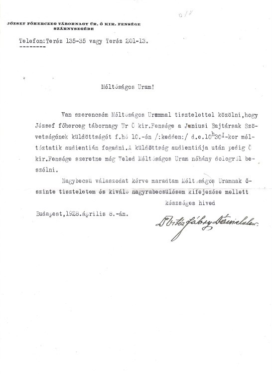 Fábry Dániel (1889-1977), József főherceg szárnysegédjének gépelt, aláírt levele 1928-ból.