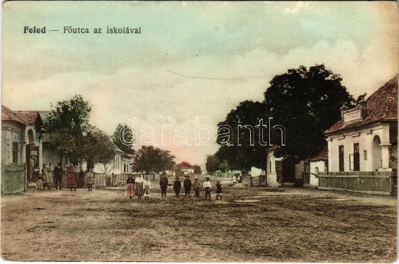 Feled, Veladin, Jesenské; Fő utca, iskola, üzlet. Vasúti levelezőlapárusítás 4328. / main street, school, shop (EK)