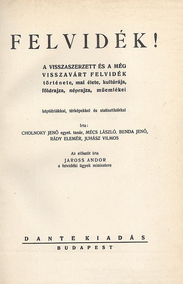 Felvidék! Felvidék! A visszatért és a még visszavárt Felvidék története, mai élete, kultúrája, földrajza, néprajza, műemlékei. Képtáblákkal, térképekkel és statisztikákkal. Irta: Cholnoky Jenő egyet. tanár, Mécs László, Benda Jenő, Rády Elemér, Juhász Vil