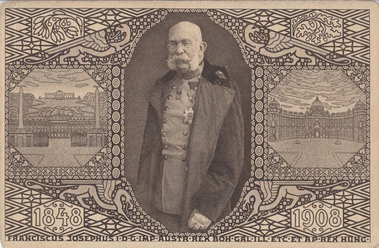 Ferenc József Jubiläums Korrespondenzkarte 1848-1908. Kolo Moser által tervezett szecessziós díjjegyes lap emlékbélyegzéssel.