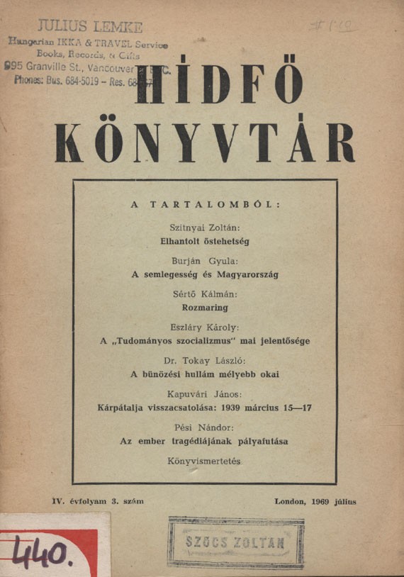 Folyóirat. Hídfő Könyvtár. 1969. július. IV. évfolyam 3. szám. Szerk. Fiala Ferenc.