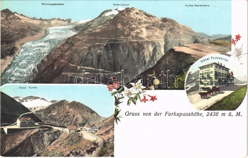 Furkapasshöhe, Hotel Furka und Furkablick, Rhonegletscher, Galenstock, Furka Passhöhe. Art Nouveau, floral
