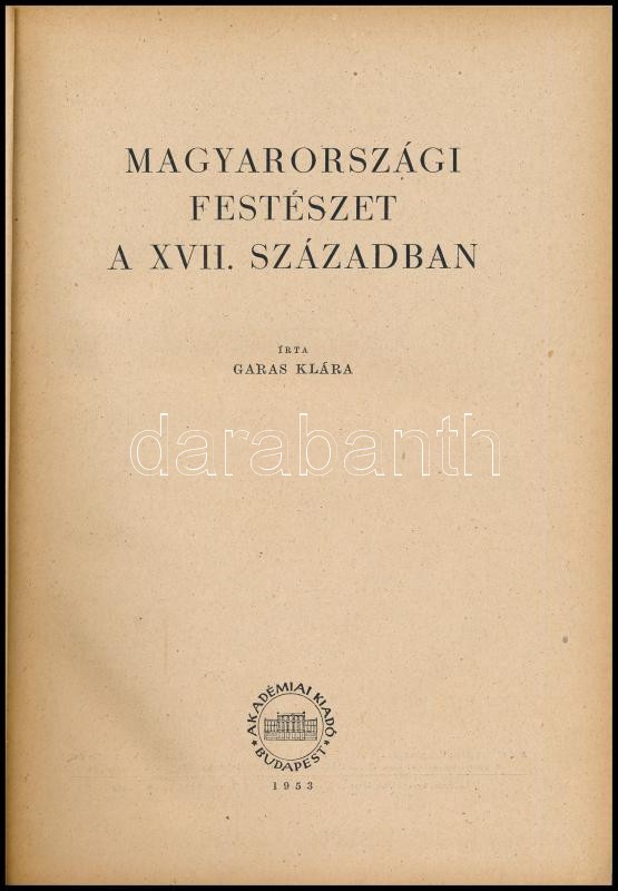 Garas Klára: Magyarországi festészet a XVII. században. Magyarországi barokk festészet. I. Bp., 1953., Akadémiai Kiadó, 206+(2) p. + LII (fekete-fehér képtáblák) t. Kiadói félvászon-kötés, kissé sérült, kopottas borítóval. Megjelent 1000 példányban.