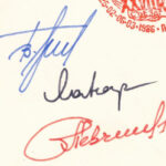 German Tyitov (1935-2000), Musza Manarov (1951- ) és Anatolij Levcsenko (1941-1988) orosz űrhajósok aláírásai emlékborítékon / Signatures of German Titov (1935-2000), Musa Manarov (1951- ) and Anatoliy Levchenko (1941-1988) Russian astronauts on