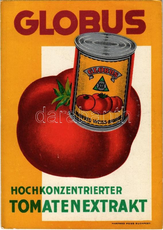 Globus konzervek német nyelvű reklámlapja. Manfred Weiss, Budapest / Hungarian canned foods advertisement in German, tomato can / Hochkonzentrierter Tomatenextrakt<a href="https://www.darabanth.com/hu/gyorsarveres/414/kategoriak~Kepeslapok/Reklam~15