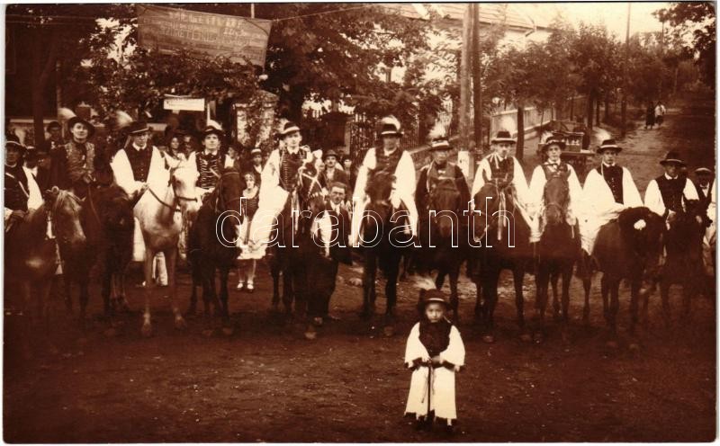 Gyömrő, Gy. Műkedvelő, Dal és Önképzőkörök szüreti mulatsága a Szabó vendéglőben, lovasok csoportképe. Pankovits István fényképészeti műterme, photo (fl)<a href="https://www.darabanth.com/hu/nagyaukcio/38/kategoriak~Kepeslapok/Magyarorszag~15644/Gyo