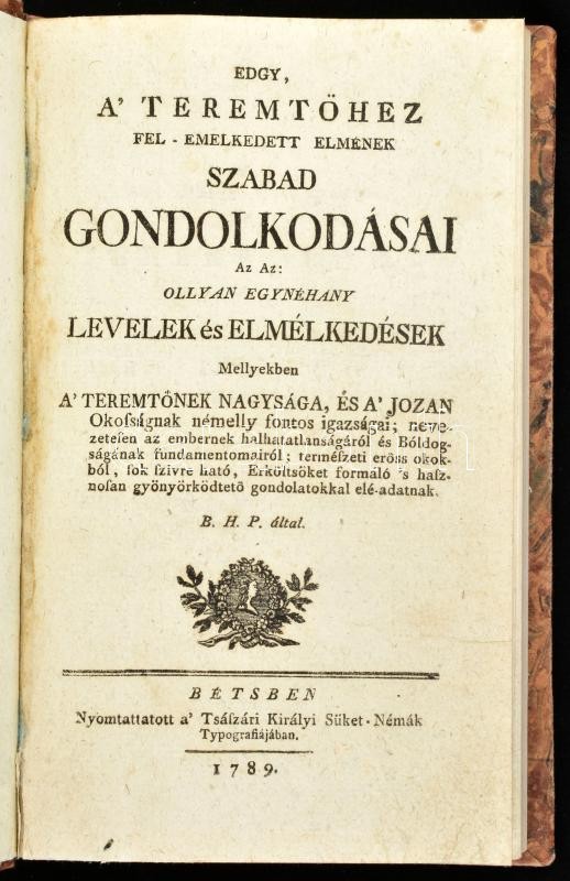 [Hari Péter]: Edgy, a’ Teremtöhez fel-emelkedett elmének szabad gondolkodásai Az Az: ollyan egynéhany levelek és elmélkedések Mellyekben a’ Teremtőnek nagysága, és a’ jozan Okosságnak némelly fontos igazságai … elé-adatnak. B. H. P. által. Első kiadás.