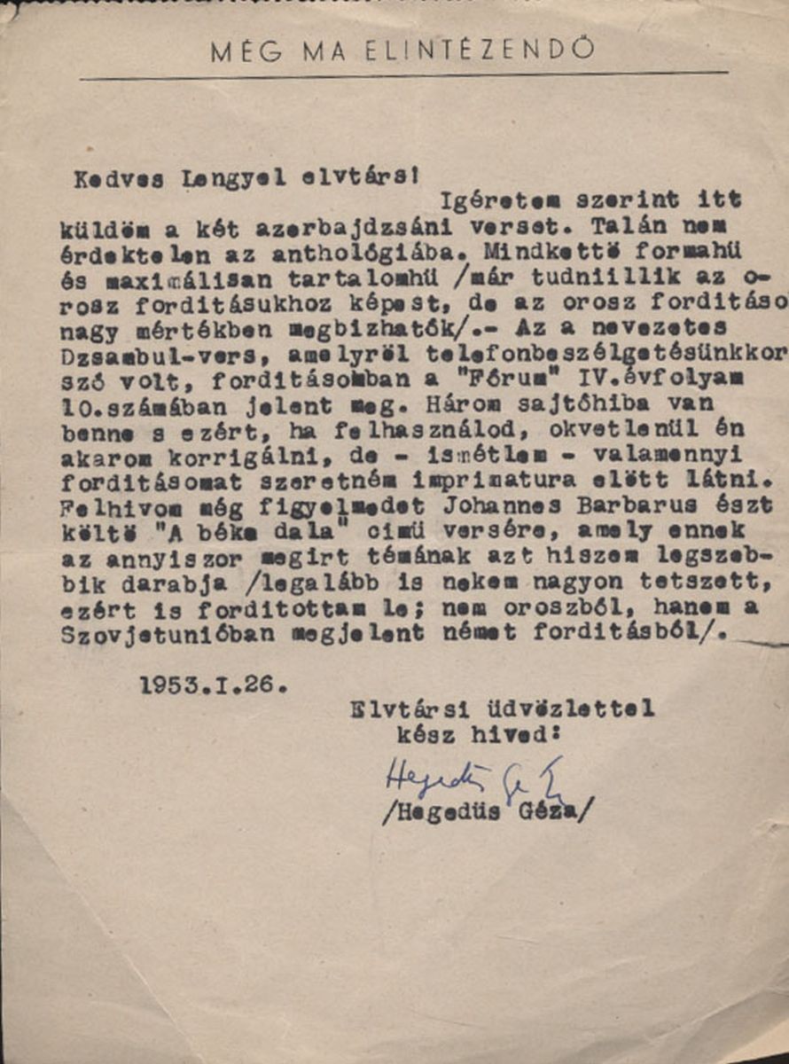 Hegedűs Géza (1912-1999) Hegedűs Géza (1912-1999) író, kritikus, egyetemi tanár gépelt, aláírt levele Lengyel Béla irodalomtörténészhez 1953-ból.