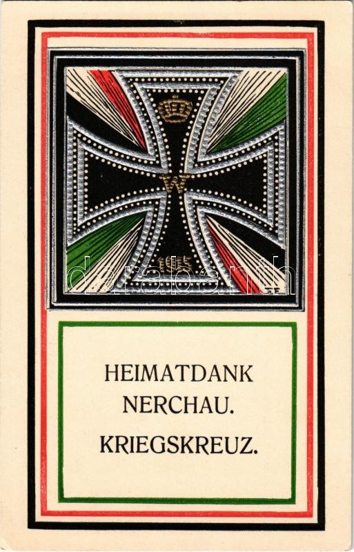 Heimatdank Nerchau. Kriegskreuz / WWI German military art postcard, Iron Cross. Emb. litho (EK)<a href="https://www.darabanth.com/hu/gyorsarveres/415/kategoriak~Kepeslapok/Katonai~1000067/Heimatdank-Nerchau-Kriegskreuz-WWI-German-military-art-postca