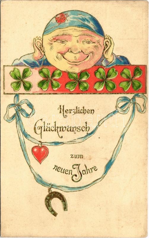 Herzlichen Glückwunsch zum neuen Jahre / New Year greeting art postcard with clovers. Emb. litho (fl)<a href="https://www.darabanth.com/hu/gyorsarveres/423/kategoriak~Kepeslapok/Udvozlolapok-Unnepek~1500093/Herzlichen-Gluckwunsch-zum-neuen-Jahre-New