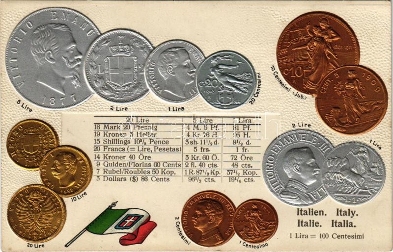 Italien – Münzenkarte und Nationalflagge. Max Heimbrecht / Olaszország – érmék és zászló. Dombornyomott / Italian coins and flag. Embossed, litho<a href="https://www.darabanth.com/hu/nagyaukcio/38/kategoriak~Kepeslapok/Numizmatika~15730/Italien-Munz