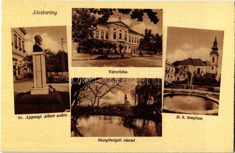 Jászberény, Városháza, Gróf Apponyi Albert szobra, Margitszigeti részlet, római katolikus templom<a href="https://www.darabanth.com/hu/gyorsarveres/414/kategoriak~Kepeslapok/Magyarorszag~1500003/Jaszbereny-Varoshaza-Grof-Apponyi-Albert-szobra-Margit