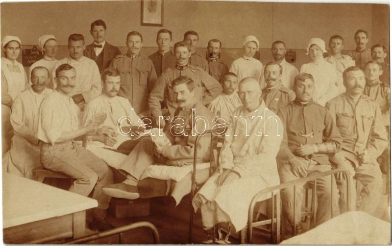 Kártyaparti egy tábori kórházban, sérült katonák, ápolók és vöröskeresztes nővérek, belső / WWI Austro-Hungarian K.u.K. military, injured soldiers playing card games at a field hospital, medics, Red Cross nurses, interior. photo<a href="https://www.