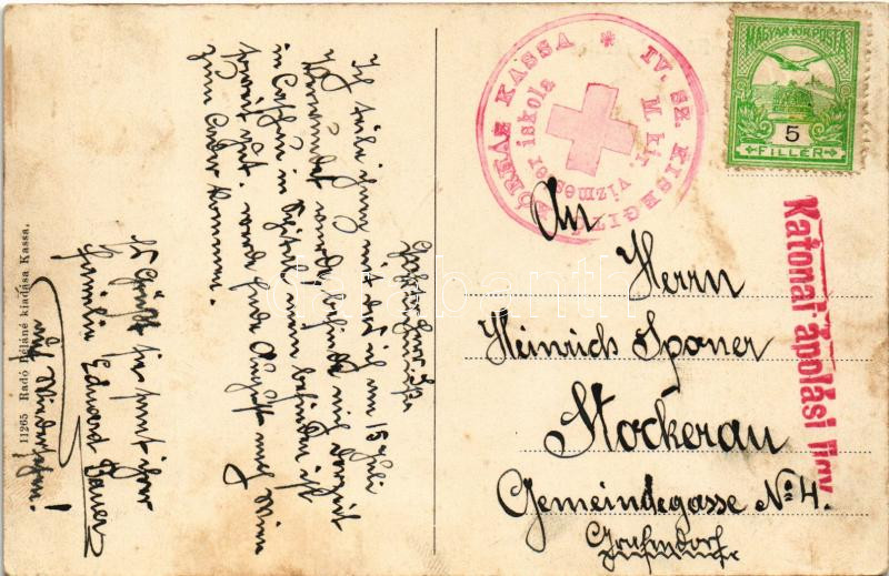 Kassa, Kosice; Fő utca, Andrássy-Udvar palota és kávéház, Dr. Holzman fogorvos rendelője, üzletek, drogéria. Radó Béláné kiadása / main street, palace and café, dentist, shops, drugstore + ‘IV. SZ. KIEGÉSZÍTŐ KÓRHÁZ KASSA M. kir. vízmester iskola’ (ázott
