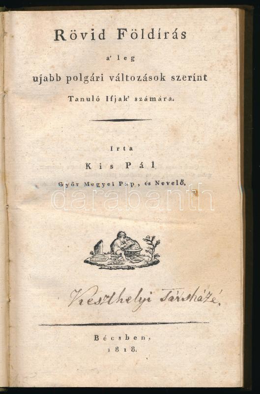 Kis Pál: Rövid földírás a’ legujabb polgári változások szerint tanuló ifjak’ számára. Írta: – – Győr megyei pap, és nevelő. Bécs, 1818, ny. n., 235+3 p. Korabeli egészvászon-kötéssel, a gerincen piros, aranyozott címkéjű címfelirattal, foxing foltos lapok