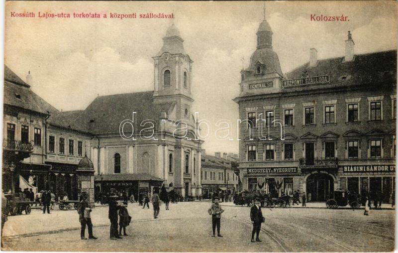 Kolozsvár, Cluj; Kossuth Lajos utca torkolata, Központi szálloda, Biasini Sándor utóda, Medgyesy és Nyegrutz, Pap Ernő üzlete, gyógyszertár / street, hotel, shops, pharmacy