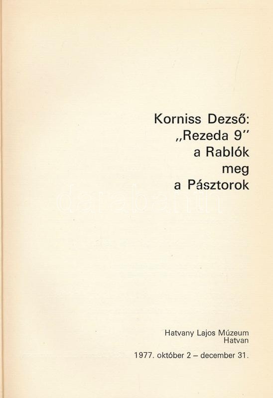Korniss Dezső: „Rezeda 9” a Rablók a meg a Pásztorok. Kiállítási katalógus. Szerk.: Kovács Ákos. Hegyi Loránd előszavával. Benne Hegyi Loránd, Nagy László, Kormos István, Keserű Katalin írásaival. Hatvany Lajos Múzeum No. 3. Bp., 1977, Hatvany Lajos Múzeu