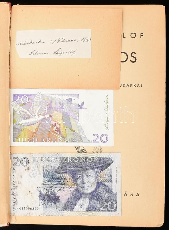Lagerlöf, Zelma: Csodálatos utazás. Nils Holgersson útja a vadludakkal. Ford: G. Beke Margit. Belatiny Braun Olga rajzaival. A szerző, Zelma Lagerlöf beragasztott autográf aláírásával és Nils Holgerssont ábrázoló svéd papírpénzekkel. Bp., é.n. Athenaeum.