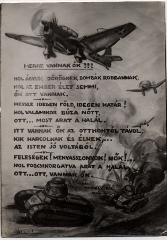 Második Világháború. Merre vannak ők. Második Világháború. Merre vannak ők. Német páncélosok és repülők magyar táj fölött. Fotómontázs. 1944.