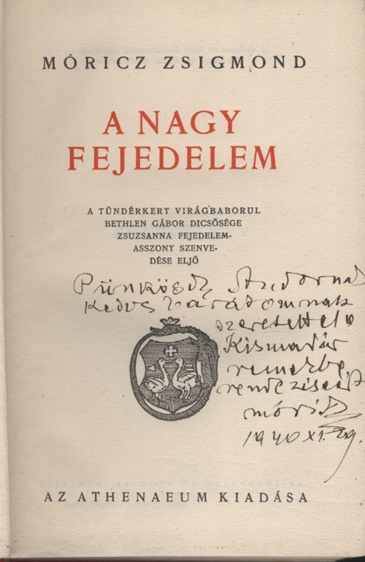 Móricz Zsigmond Móricz Zsigmond: A nagy fejedelem. Pünkösti Andornak dedikált példány.