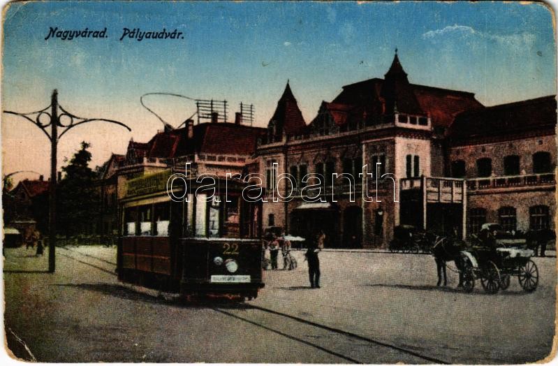 Nagyvárad, Oradea; vasútállomás, villamos / railway station, tram (EB)