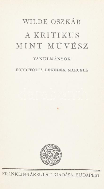 Oscar Wilde 2 kötete: Wilde Oszkár: Versek. Ford. és Wilde-ről szóló tanulmánnyal bevezette: Radó Antal. + A kritikus, mint művész. Tanulmányok. Ford.: Benedek Marcell. Wilde Oszkár összes művei. Bp., é.n., Franklin-Társulat. Kiadói aranyozott egészvászon