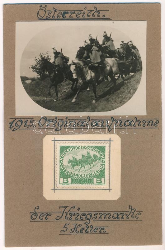 Österreich 1915. Originalaufnahme. Der Kriegsmarke 5 Heller. / WWI Austro-Hungarian K.u.K. military, custom-made card with original photo and stamp (non PC) (EK)<a href="https://www.darabanth.com/hu/gyorsarveres/415/kategoriak~Kepeslapok/Katonai~100