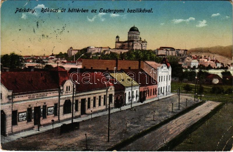 Párkány, Parkan, Stúrovo; Rákóczi út, Községi nagyvendéglő, étterem és kávéház, háttérben az Esztergomi bazilika / street view, restaurant and café, basilica (lyuk / hole)