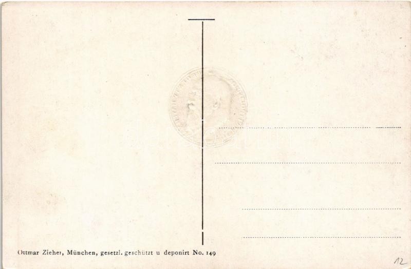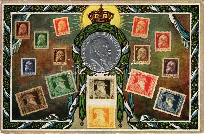 Prinzregent Luitpold von Bayern / Luitpold bajor királyi herceg. Dombornyomott érme és bélyegek / Luitpold, Prince Regent of Bavaria. Embossed coin and stamps.Ottmar Zieher No. 149. Art Nouveau<a href="https://www.darabanth.com/hu/nagyaukcio/38/kate