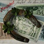 Prosit Neujahr! / New Year greeting art postcard with German banknotes, horseshoe and clovers