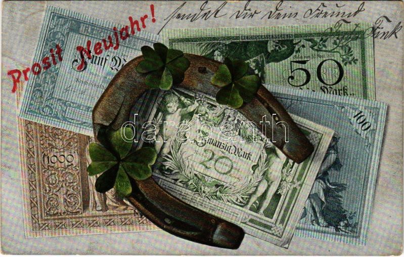 Prosit Neujahr! / New Year greeting art postcard with German banknotes, horseshoe and clovers<a href="https://www.darabanth.com/hu/gyorsarveres/416/kategoriak~Kepeslapok/Numizmatika~2000068/Prosit-Neujahr-New-Year-greeting-art-postcard-with-German-b