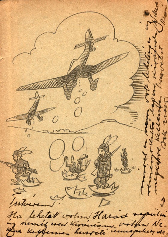 Repülés, aviatika. Tábori postai levelezőlap 1944-ből, repülős vonatkozású húsvéti grafikával.