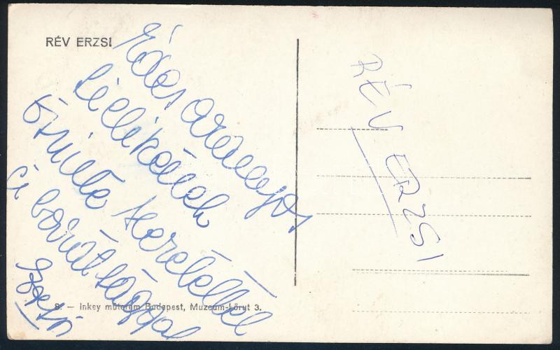 Rév Erzsi színésznő autográf dedikálása őt ábrázoló fotólapon