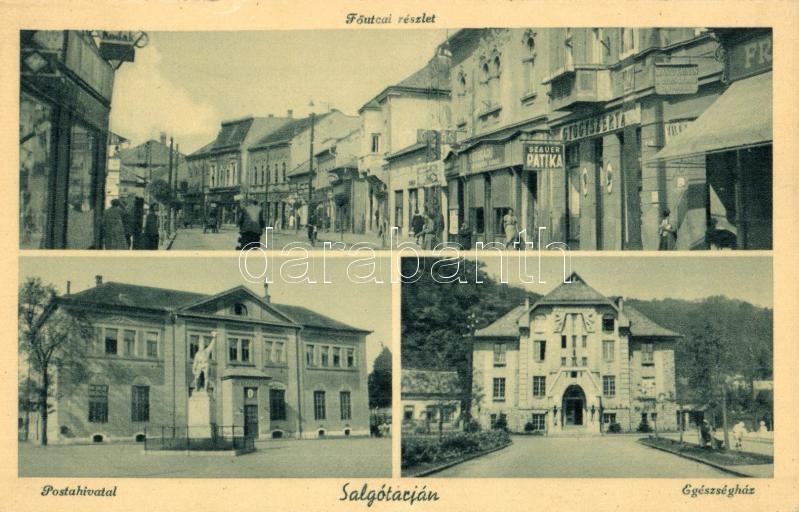 Salgótarján, Fő utca, Szauer patika, Gyógyszertár, üzletek, Posta hivatal, Hősök szobra, Egészségház