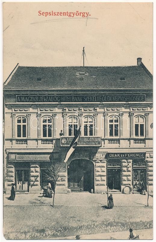 Sepsiszentgyörgy, Sfantu Gheorghe; Magyar Jelzálog Hitelbank Székelyföldi Képviselősége, Gazdák Szövetkezete, Deák és Ferenc üzlete. Benkő Mór kiadása / shops, Szeklerland Representation of the Hungarian Mortgage Credit Bank (EM)<a href="https://www