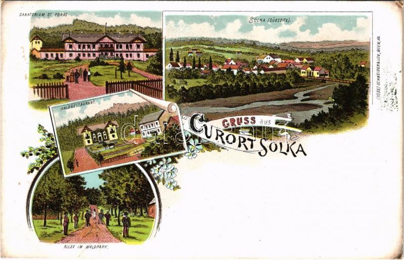 Solca, Szolka, Solka (Bukovina); Gruss aus Curort Solka. Sanatorium Dr. Poras, Waldrestaurant, Allee im Waldpark / spa, sanatorium, forest restaurant, park. Schneider & Lux, Wien. Art Nouveau, floral, litho (EK)<a href="https://www.darabanth.com/hu/