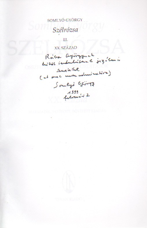 Somlyó György Somlyó György: Szélrózsa. Összegyűjtött versfordítások. III. XX. század. Rába Györgynek dedikált példány.