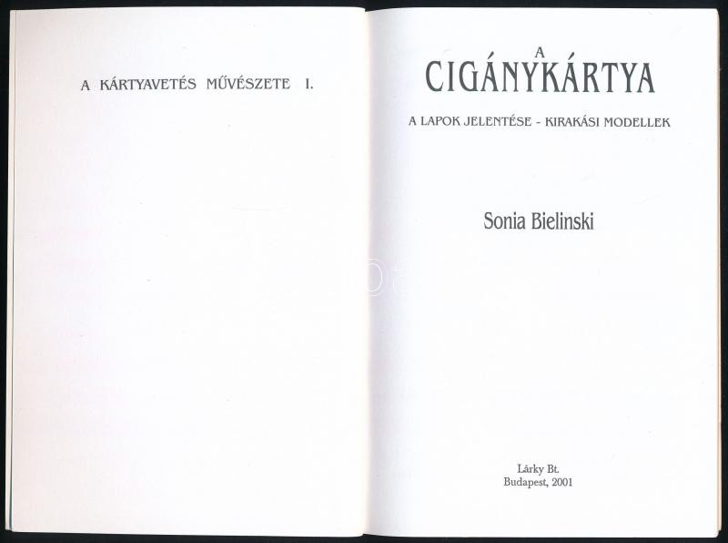 Sonia Bielinski: A cigánykártya. A lapok jelentése – Kirakási modellek. A kártyavetés művészete I. Bp., 2001, Lárky Bt. Kiadói papírkötés.<a href="https://www.darabanth.com/hu/gyorsarveres/423/kategoriak~Konyvek/Konyvek-Egyeb-ritkasagok~2000023/Soni
